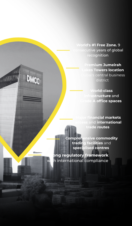 The DMCC, the 9-time World's #1 Free Zone in Dubai's JLT, provides world-class infrastructure, Grade A offices, access to markets and trade routes, extensive commodity trading facilities, and a strong, internationally compliant regulatory framework.