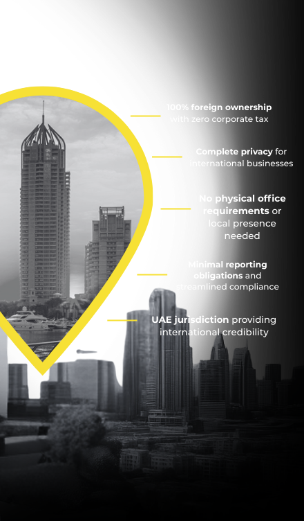 RAK International Corporate Centre offers 100% foreign ownership, zero corporate tax, complete privacy, and flexible offshore structure with no physical office requirements.